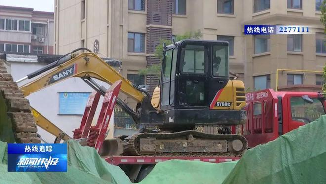 记者在围墙里边看到,小区内停放着挖掘机和雾炮等施工设备。记者试图找到施工方来了解围墙倒塌的情况,但是几经打听也没有找到。随后,记者想进入和园小区了解情况,但是却遭到了物业的拒绝。