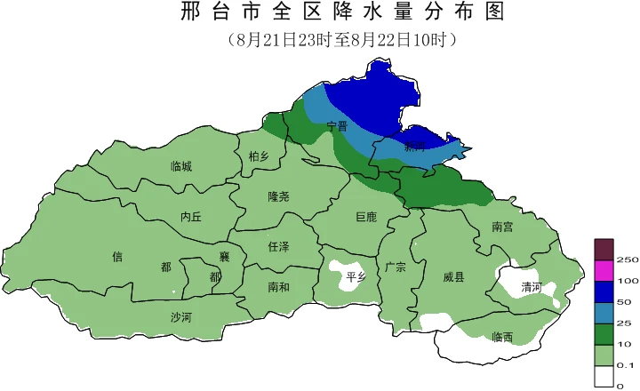 【21日23时—22日10时】,我市出现分散性雷阵雨或阵雨,平均降雨量7.2毫米,10毫米以上35站出现在新河、柏乡、南宫、宁晋、巨鹿,25毫米以上18站出现在宁晋、新河,50毫米以上12站出现在宁晋、新河,最大宁晋纪昌庄86.1毫米,最大小时雨量宁晋四芝兰65.2毫米(22日07:00—08:00)。市区最大降雨量市气象局1.8毫米。邢台皇寺出现8级瞬时大风为20.1米/秒。目前我市降雨结束,风力逐渐减弱。