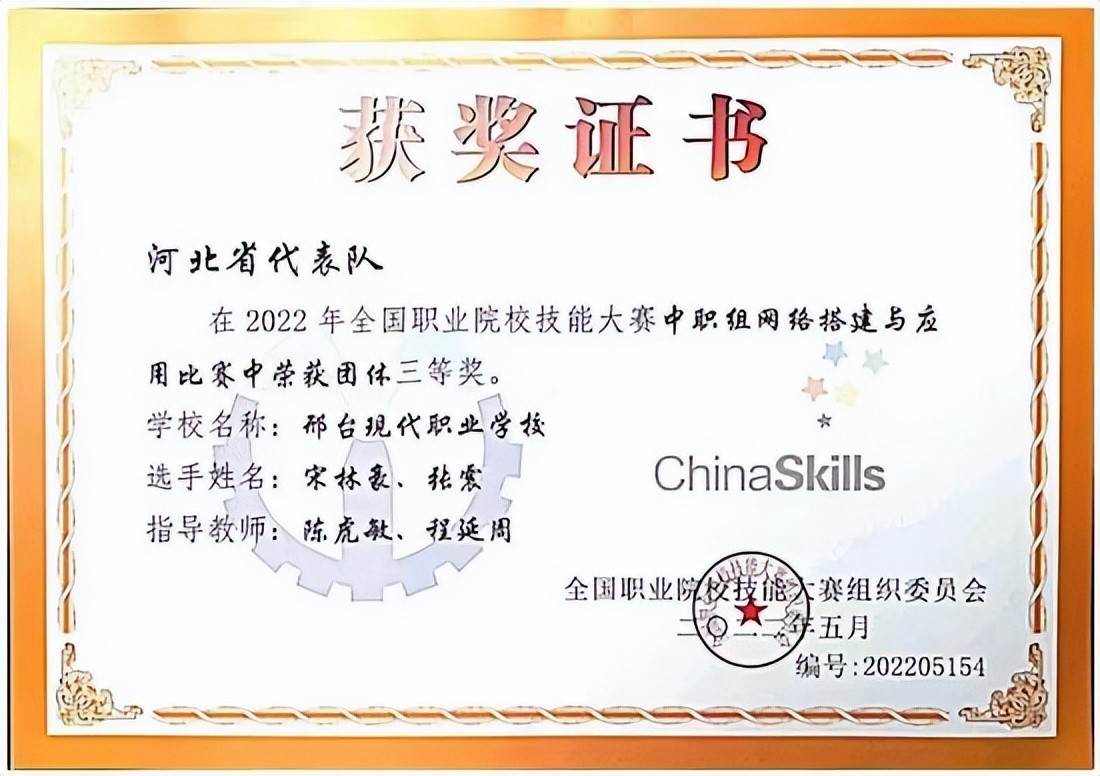 近日,2022年全国职业院校技能大赛(中职组)网络搭建与应用赛项在山东滨州举办,本项目比赛由来自全国35个省(市、区)的67支代表队参赛,经过八个小时的激烈角逐,由陈虎敏,程延周老师指导的邢台现代职业学校计算机网络技术专业2007班张震、2008班宋林豪两位同学荣获团体三等奖。