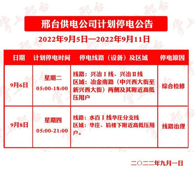 从邢台供电公司获悉,9月6日、8日,邢台部分区域将计划停电,具体时间和大致位置如下: