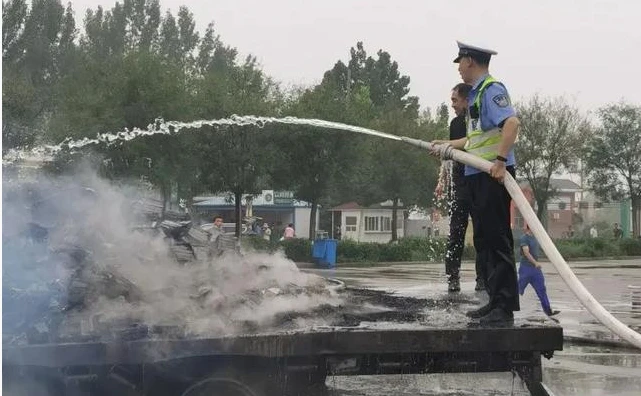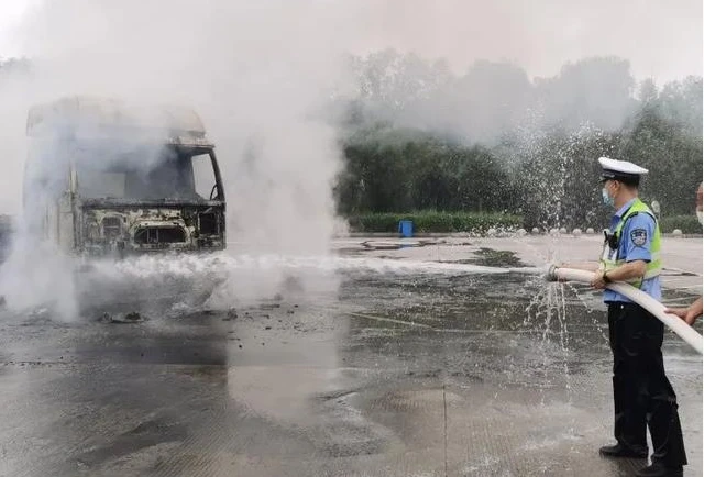 在现场交警看到一辆重型半挂车货仓已经着火,司机在一旁不知所措。交警立即冲上前去封锁现场,及时联系当地消防部门。为避免火势蔓延发生交通事故,他们一人引导其他人员和车辆转移,一人在服务区拉来高压水枪紧急灭火。