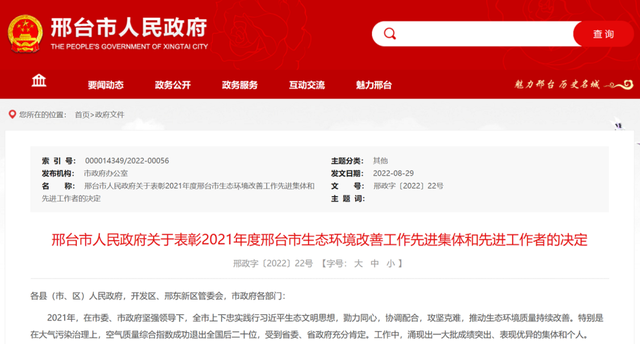 关于表彰2021年度邢台市生态环境改善工作