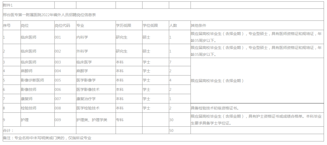 1.具体招聘人数和岗位条件详见《邢台医专第一附属医院2022年招聘编外人员岗位信息表》,其中专业参考教育部《授予博士、硕士学位和培养研究生的学科、专业目录》《普通高等学校本科专业目录》《普通高等学校高等职业教育(专科)专业目录(2015年)》设置;