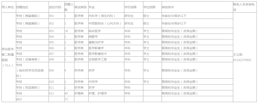 1.具体招聘人数和岗位条件详见《邢台医专第二附属医院招聘编外工作人员岗位信息表》,其中专业参考教育部《授予博士、硕士学位和培养研究生的学科、专业目录》《普通高等学校本科专业目录》《普通高等学校高等职业教育(专科)专业目录(2015年)》设置;