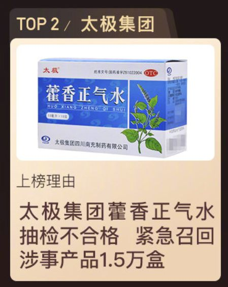 标示为四川天府康达药业集团府庆制药有限公司、太极集团四川南充制药有限公司生产的3批次藿香正气水不符合规定,不符合规定项目为甲醇量。据悉,甲醇量反映的是酒剂或酊剂等含乙醇制剂中可能由乙醇带来的甲醇的含量。