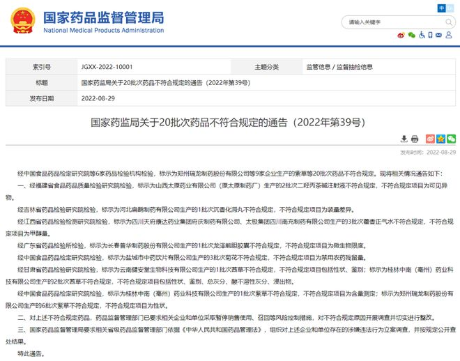 标示为河北扁鹊制药有限公司生产的1批次沉香化滞丸不符合规定,不符合规定项目为装量差异。据悉,装量差异系反映药物均匀性的指标,是保证准确给药的重要参数之一。