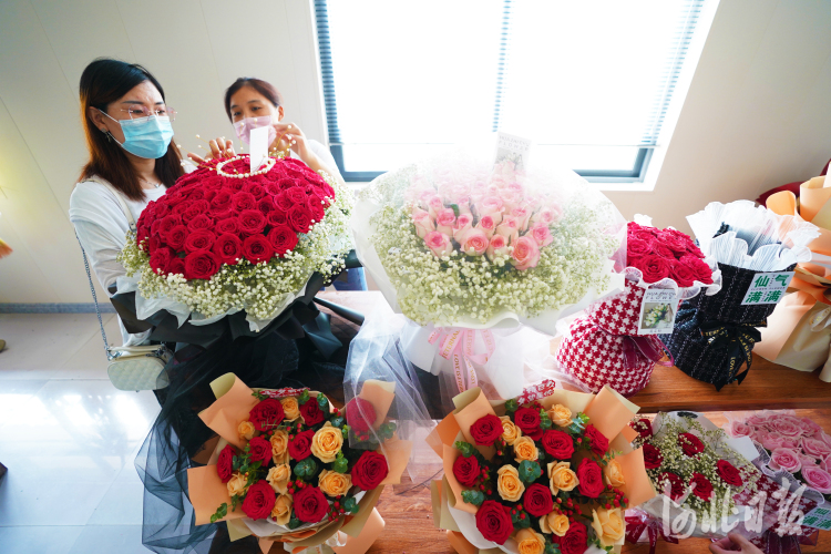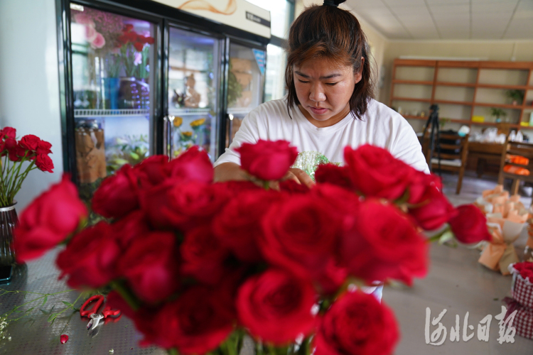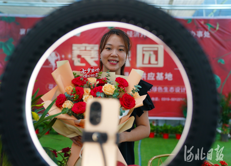 邢台经济开发区火炬街道田家庄社区襄巢园花卉基地工作人员在直播销售鲜花。