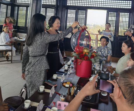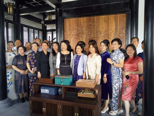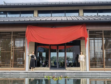 2022年9月17日上午9点36分,湖北渝山城投集团董事长王敏女士与北京华信源木业有限公司总经理李君女士共同按下开业启动球的开关,象征吉祥顺利的红色丝带,伴随着气球缓缓升起,意味着渝山·博雅集正式面世。