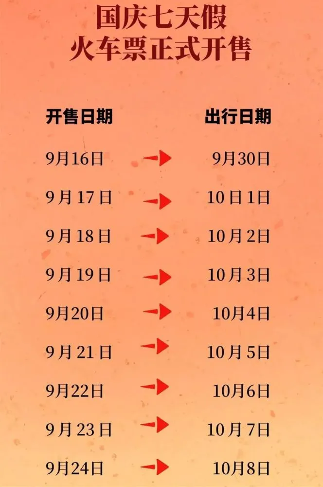按照铁路客票预售期15天的规定,9月17日起,旅客可以通过12306网站、APP等购买国庆黄金周首日(10月1日)的火车票,10月6日和7日的火车票将分别于9月22日和23日开售。