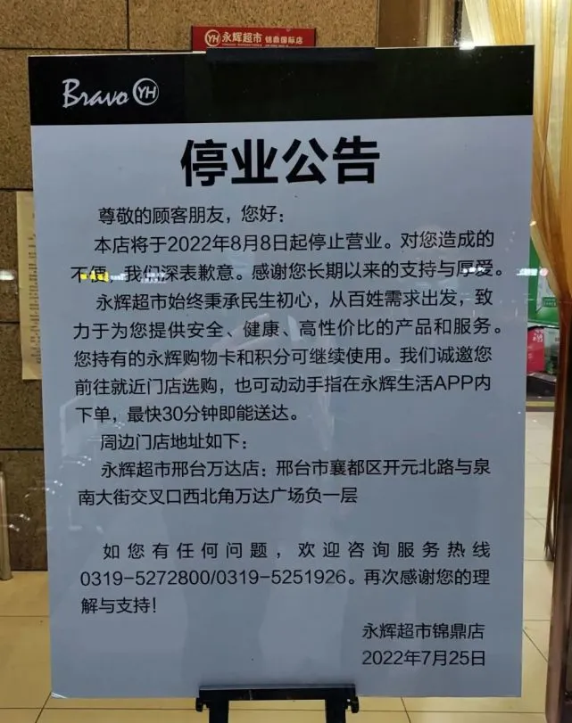 7月25日,永辉超市锦鼎国际店发布停业公告,8月8日前闭店清仓中……
