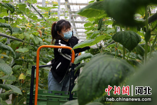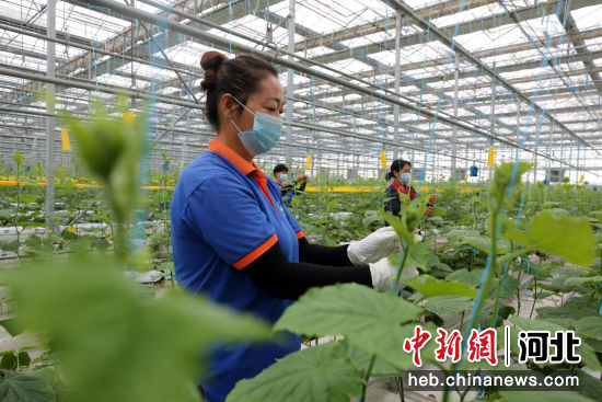 在河北省邢台市南和区贾宋镇一家现代农业园区,工人正在采摘黄瓜。