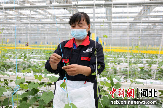 在河北省邢台市南和区贾宋镇一家现代农业园区,工人正在为丝瓜秧苗吊蔓。