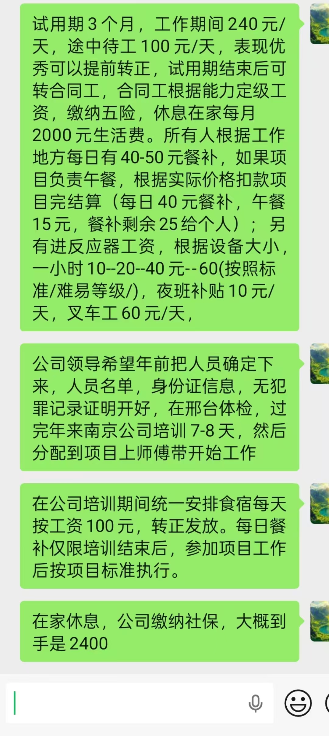 2,试用期3个月,工作期间240元/天,途中待工100元/天,表现优秀可以提前转正,试用期结束后可转合同工,合同工根据能力定级工资,缴纳五险,休息在家每月2000元生活费。所有人根据工作地方每日有40-50元餐补,如果项目负责午餐,根据实际价格扣款项目完结算(每日40元餐补,午餐15元,餐补剩余25给个人): 有进反应器工资,根据设备大小一小时10--20--40元--60(按照标